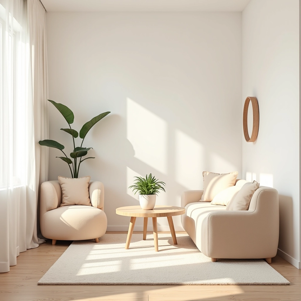 Sala de estar minimalista com luz natural portuguesa, elementos de cortiça e paleta de cores clara